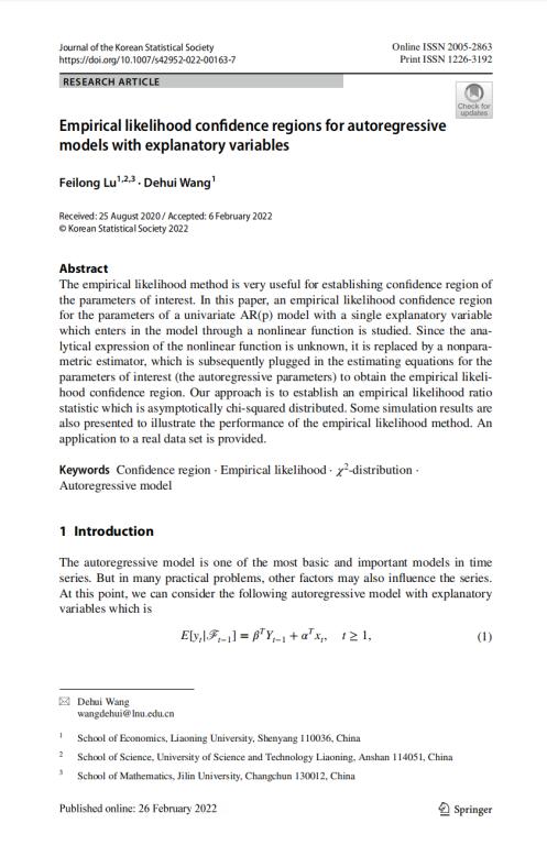 数学与统计学院王德辉教授与博士研究生卢飞龙在国际学术期刊Journal of the Korean Statistical Society合作发表题为Empirical likelihood confdence regions for autoregressive models with explanatory variables的学术论文。