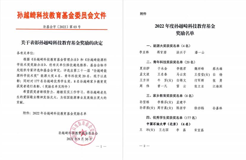 孙越崎科技教育基金会是199210月由朱学范、钱伟长、程思远等20位知名人士倡议创立。孙越崎基金委员会设有孙越崎能源科学技术奖,该奖项1992年设立,是经国家科技奖励办公室批准的正式奖项,包括“能源大奖”、“青年科技奖”、“优秀学生奖”、“家乡教育奖”,每年评审并颁奖一次,该奖项为推动我国能源领域科技创新做出了重大贡献。本届共评选出孙越崎“能源大奖”4名、“青年科技奖”20名、“优秀学生奖”177名、“家乡教育奖”8名。“能源大奖”获得者在能源基础理论突破和科技进步方面做出了重大贡献,历届获奖者中有多位当选中国科学院或工程院院士。